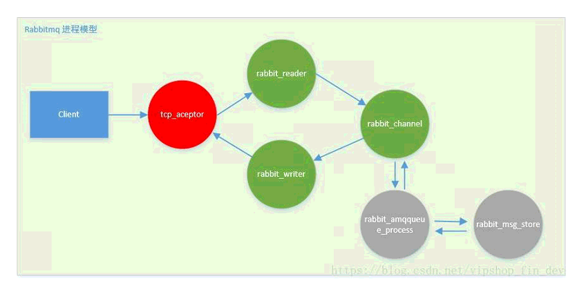 在整个系统中,存在一个tcp_accepter进程,一个rabbit_msg_store进程,有多少个队列就有多少个rabbit_amqqueue_process进程,每个客户端连接对应一个rabbit_reader和rabbit_writer进程。