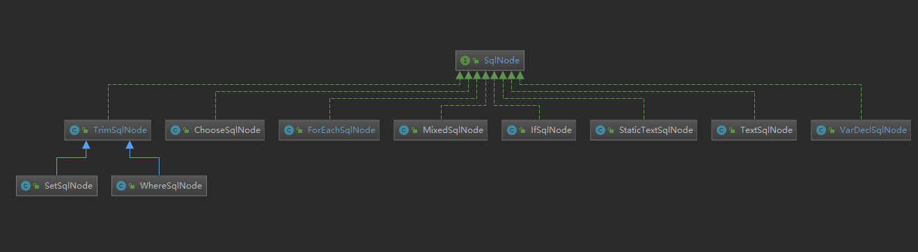 StaticTextSqlNode 用于存储静态文本,TextSqlNode用于存储带有${}占位 符的文本,IfSqlNode 则用于存储
